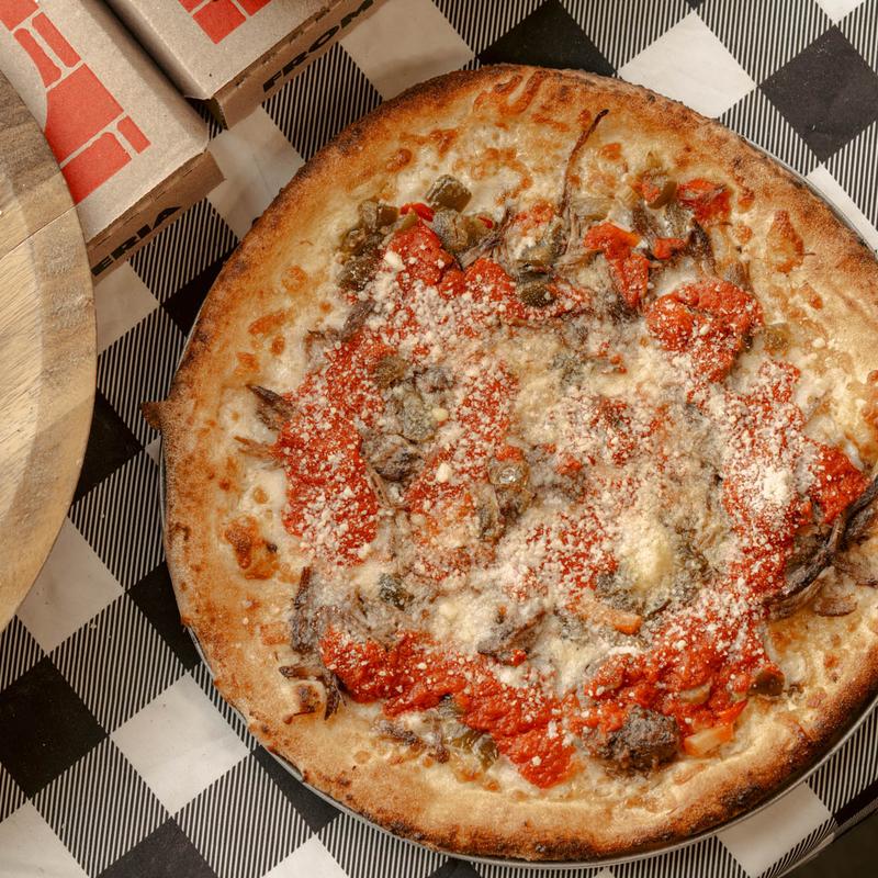 Braised beef, giardinara, 5050 cheese blend, and pizza sauce topped off with ground parmesan